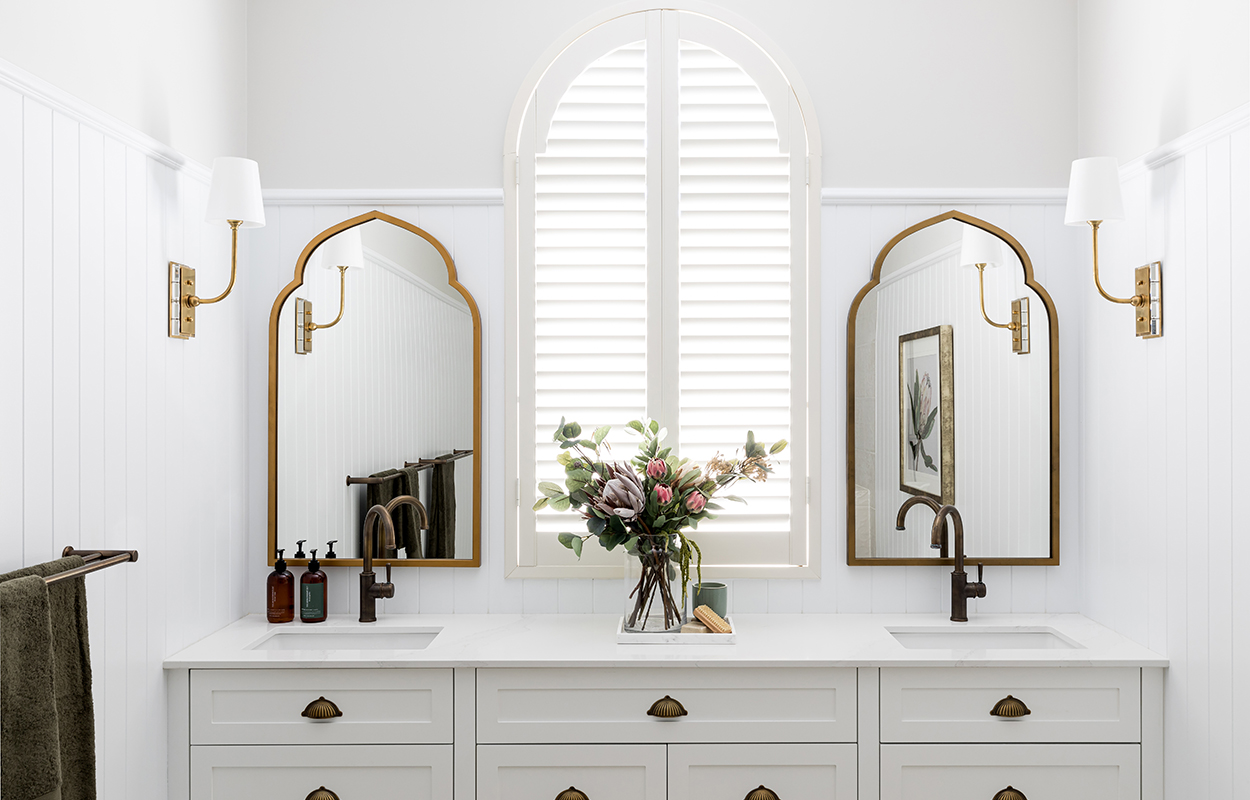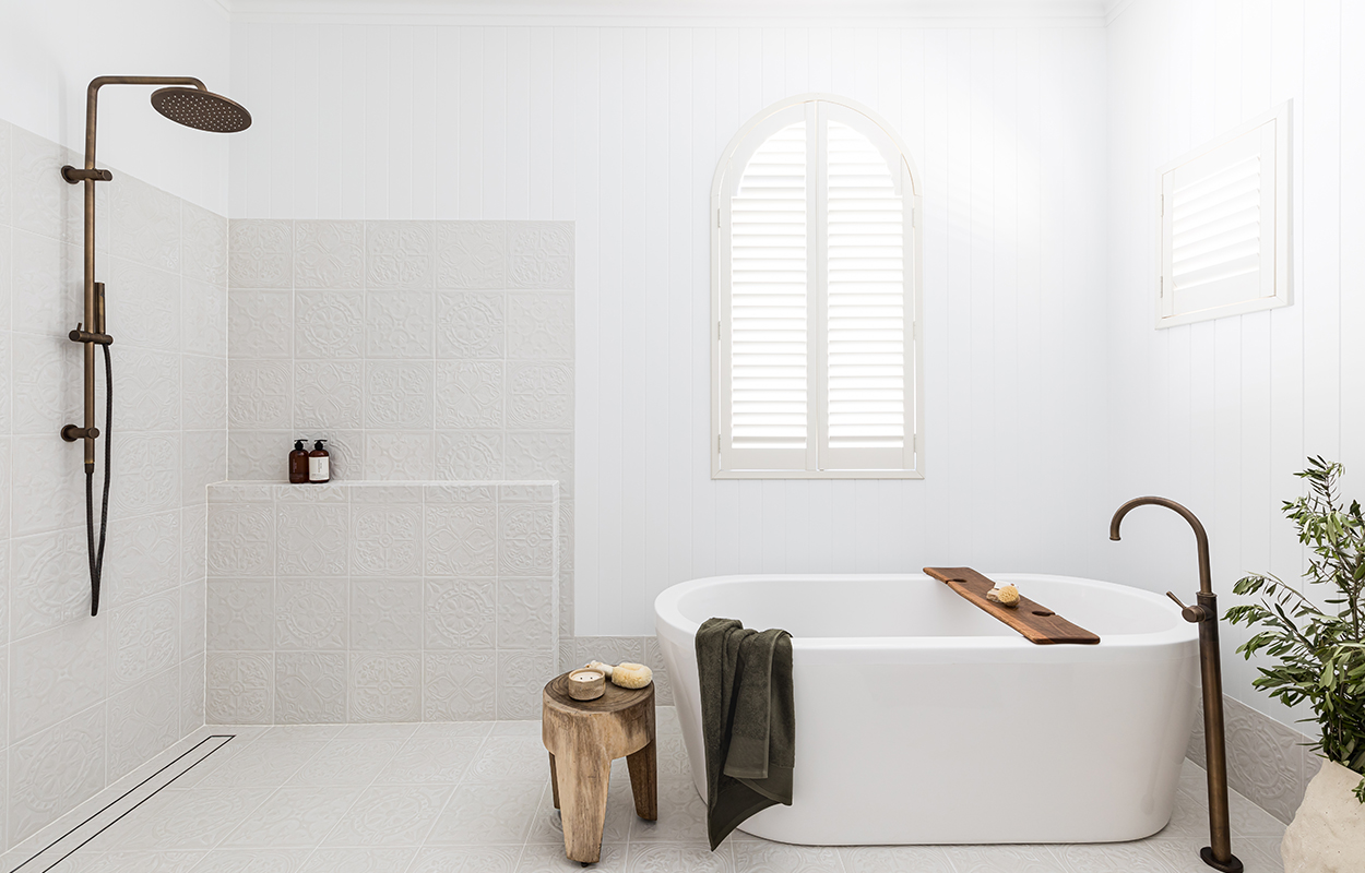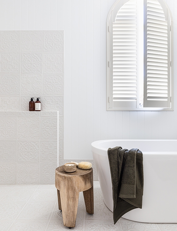 The main bathroom has a more minimalist design than the living areas, though carrying through the same dreamy feel, created in this space by the lining boards and texturally detailed tiles. Bright whites accented by aged brass fittings feature in this sundrenched space, working together with natural aspects such as the timber stool and native plants.