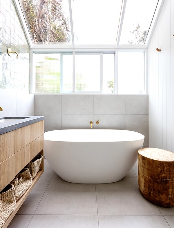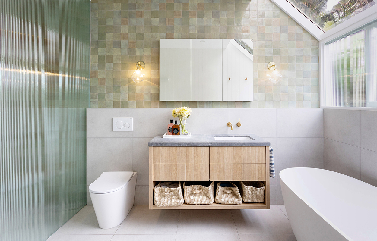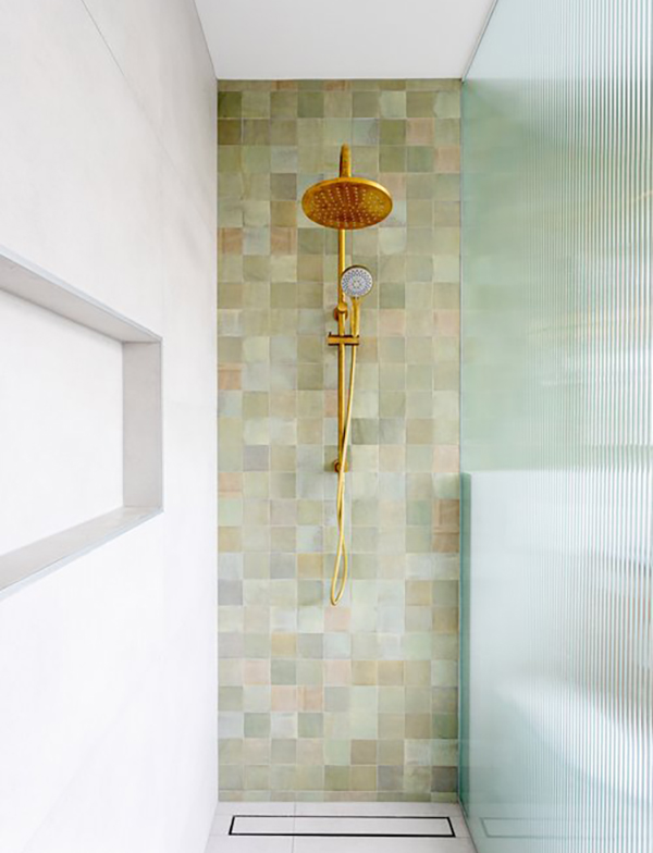 The incredibly high ceilings and chunky timber windows inspired the selection of materials that would bounce natural light throughout the home. The main bathroom features muted greens, inspired by the beautiful surrounding gardens, and vertical fluted glass to accentuate the heights and levels.