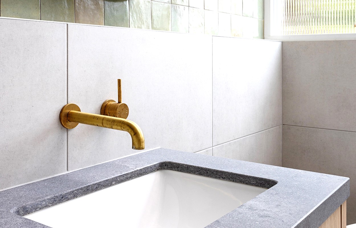 Pegasi tapware in Raw Brushed Brass adds a subtle textural element to the space with its clean design and brushed finish. The look is completed with concrete stone and the timber vanity for a space that is both earthy and coastal.