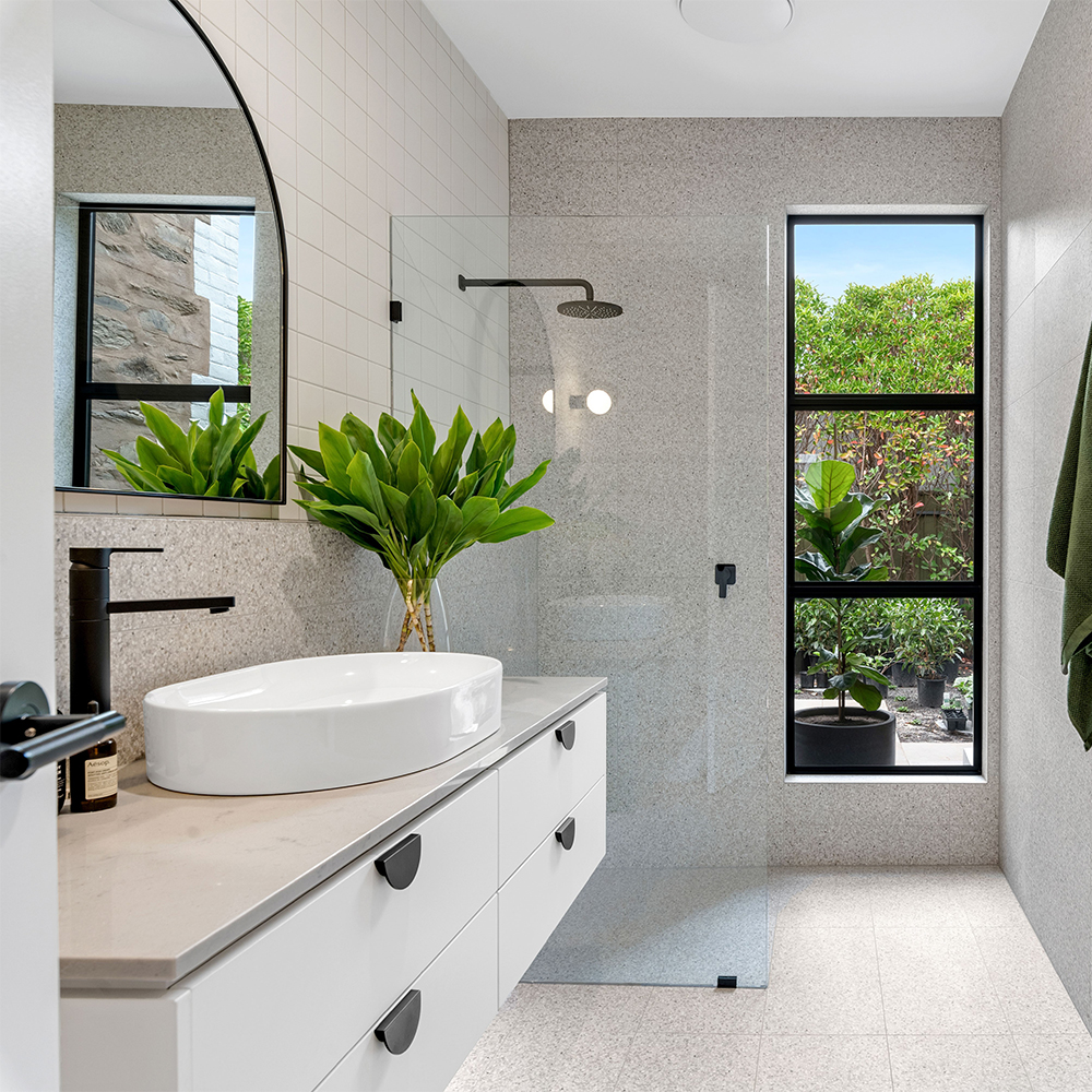We love how bright and spacious the bathroom in is. The large window, light floor to ceiling tiles and pops of greenery make this contemporary space feel so inviting.