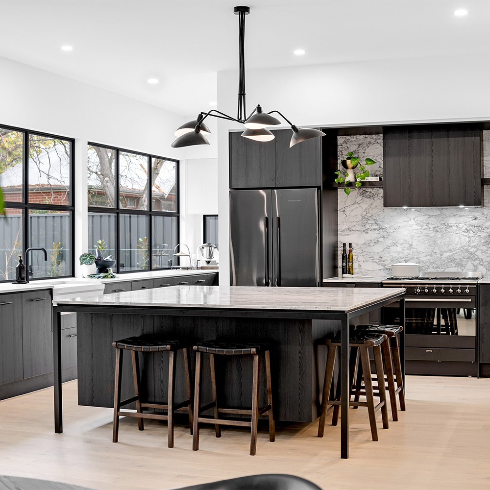 The stunning monochrome kitchen features edgy black Laminex PureGrain cabinetry and bench tops and matching splashbacks in Arabescato marble by Alano Australia. Quicksteps Creamy White Oak matte was chosen for the flooring to tie in with the whitewashed baltic pine in the existing part of the home.