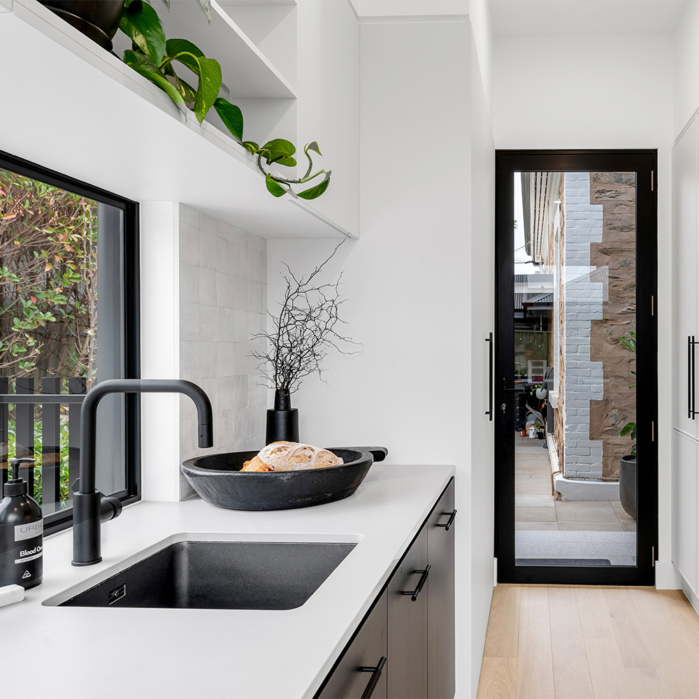 New life is breathed into this 1800’s bluestone family home, fondly named Cottage on George, with a contemporary extension to the rear of the home. The new extended footprint encompasses a study, bathroom, family living, kitchen and butler’s pantry. The project located in Clarence Park is interior designer Penny Crompton’s own home and has been completed by award winning builders Desyn Homes.