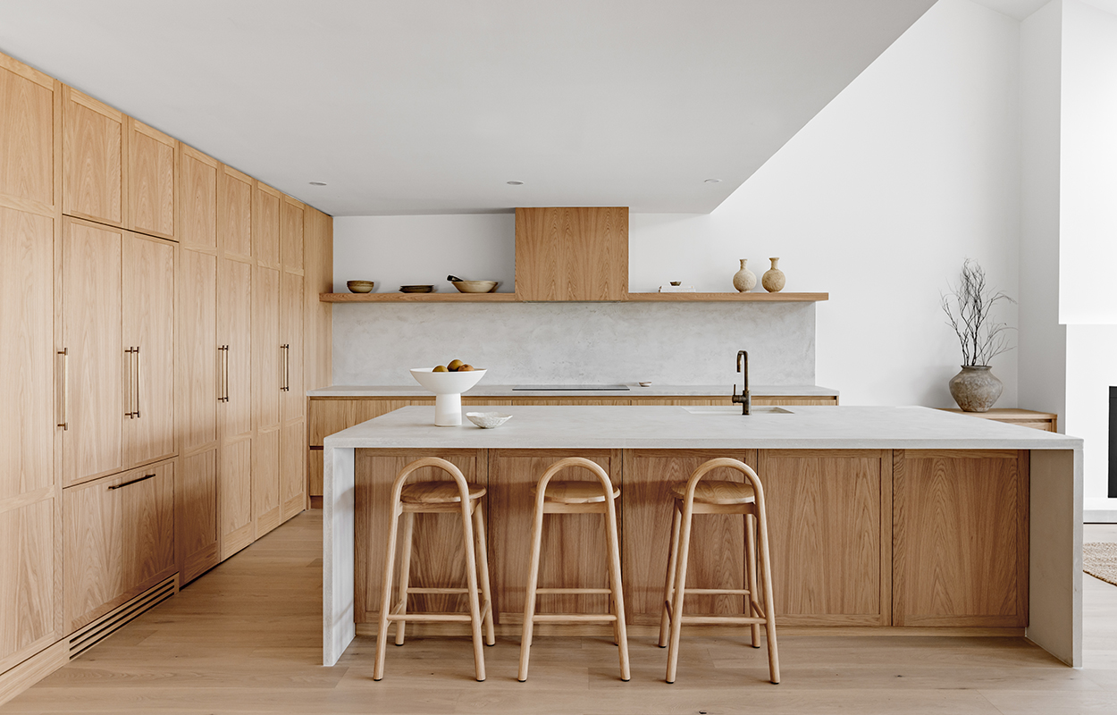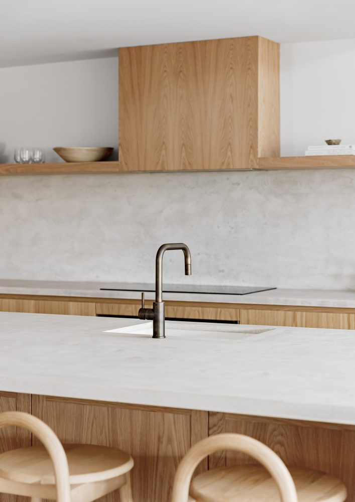 Oak is the primary material used in this kitchen, and for good reason. It’s modern, homely, and brings an element of nature into any space. It’s incredible depth and texture within the kitchen cabinetry is enhanced by the muted concrete countertops and clean structural lines, which accentuate the curves and unpredictability of the wood’s natural grain. Our Pegasi sink mixer in Antique Brass Light contributes to the organic character of this project with its beautifully proportioned design and stunning natural finish.