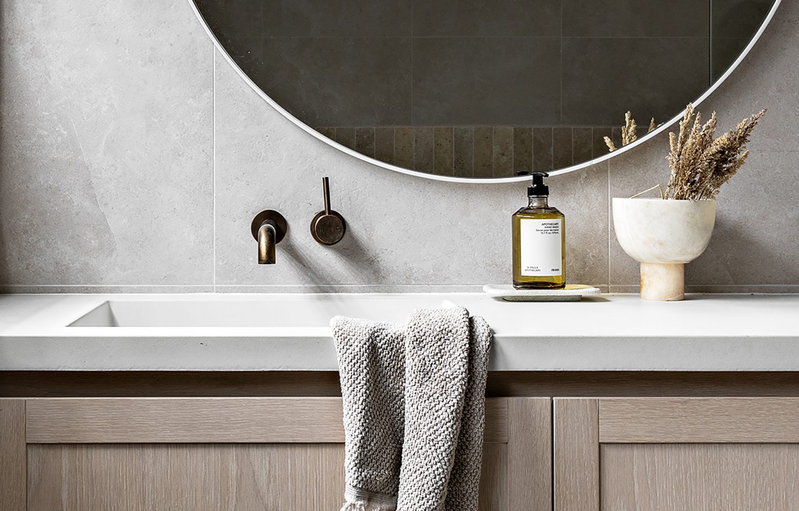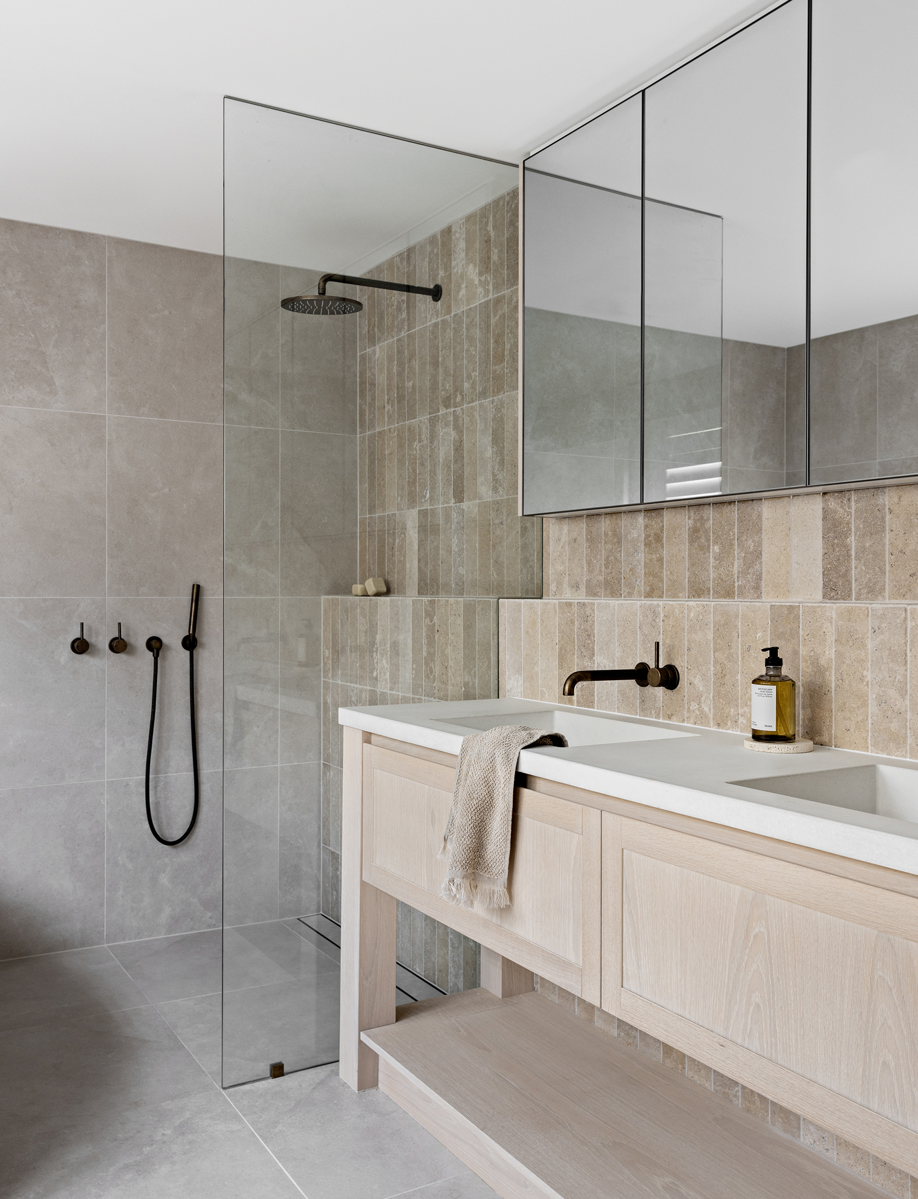 The main bathroom features a curated collection of raw materials including aged brass, oak and concrete to create a muted, tranquil space. Elegant stone feature tiles line the full length wall shelf, adding depth and intimacy. The space is finished with beautiful attention to detail, featuring our Pegasi tapware and a luxe round mirror. Each selection holds meaning, embodying Kate’s underlying purpose to pay tribute to her childhood and family connections.