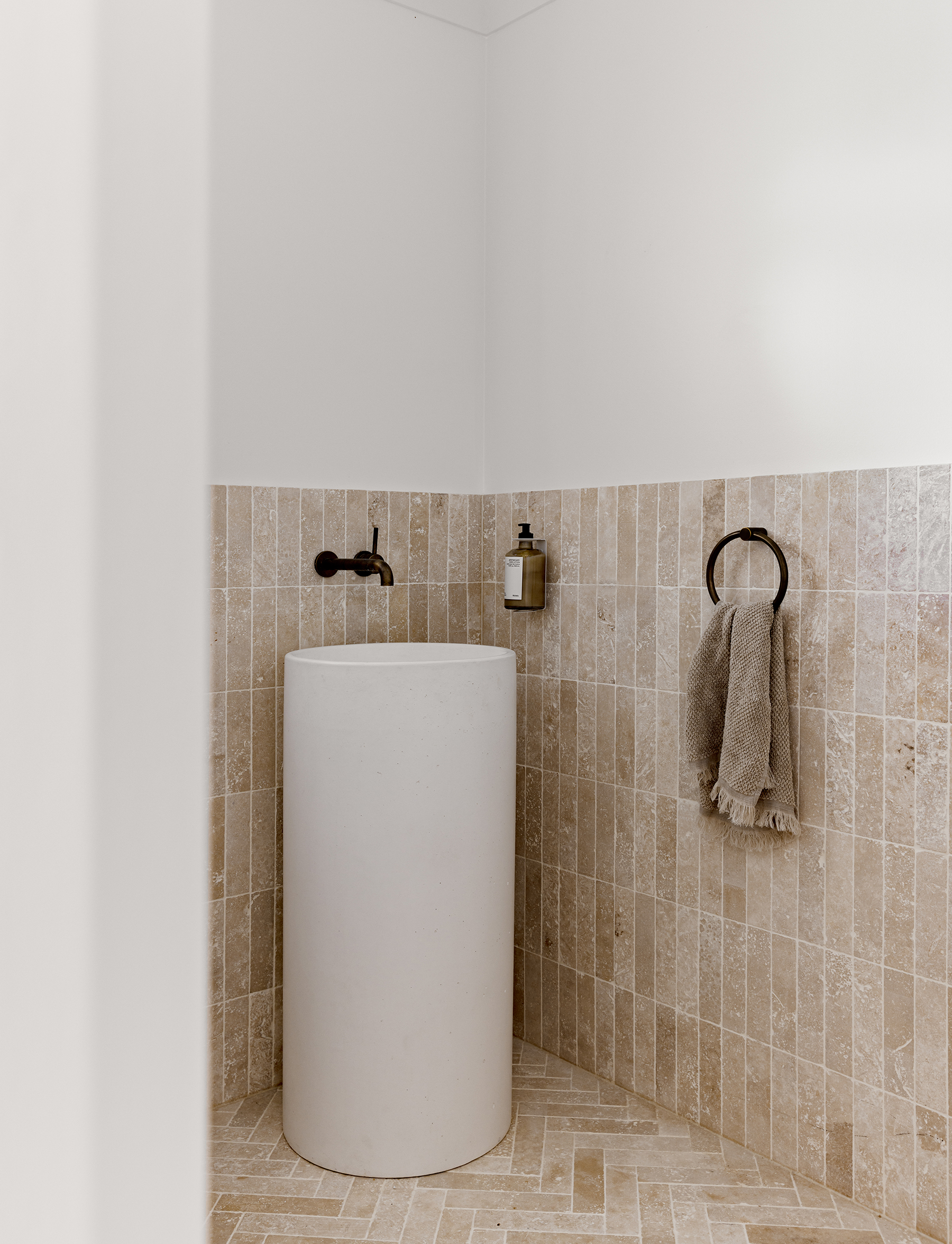 The selections used in the main bathroom have been carried across to the ensuite and powder room for a calm, cohesive look throughout the home. The floor feature tiles in the powder room are arranged in a herringbone pattern for a bolder take on the same look. Dreamy natural tones and textures are continued, as are antique brass finishes which complement the earthy palette and enhance the warmth of the tiles.