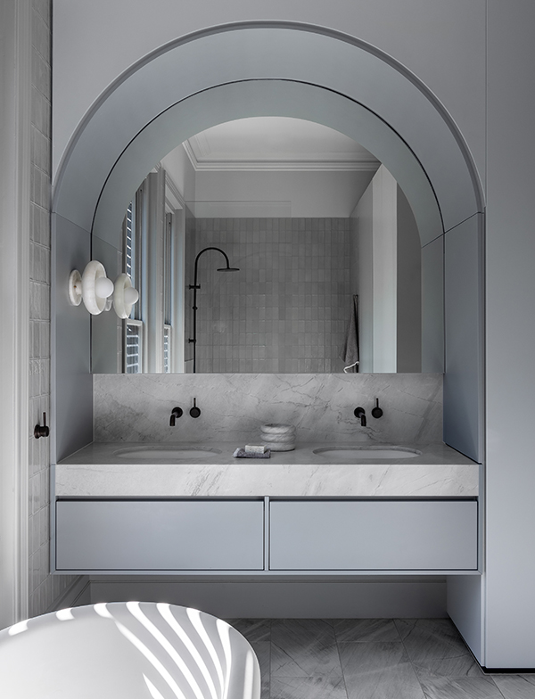 This bathroom extends upon the cool, muted shades used, with powder blue cabinetry and traditional grey tiles. The giant arch above the vanity maintains the old-world charm of the home, and when paired again with antique brass tapware, the space is elegant and classic.