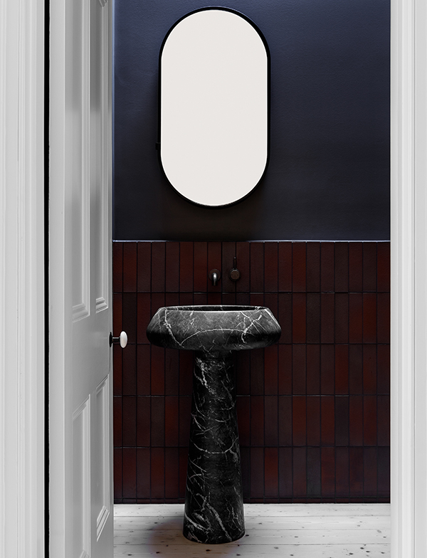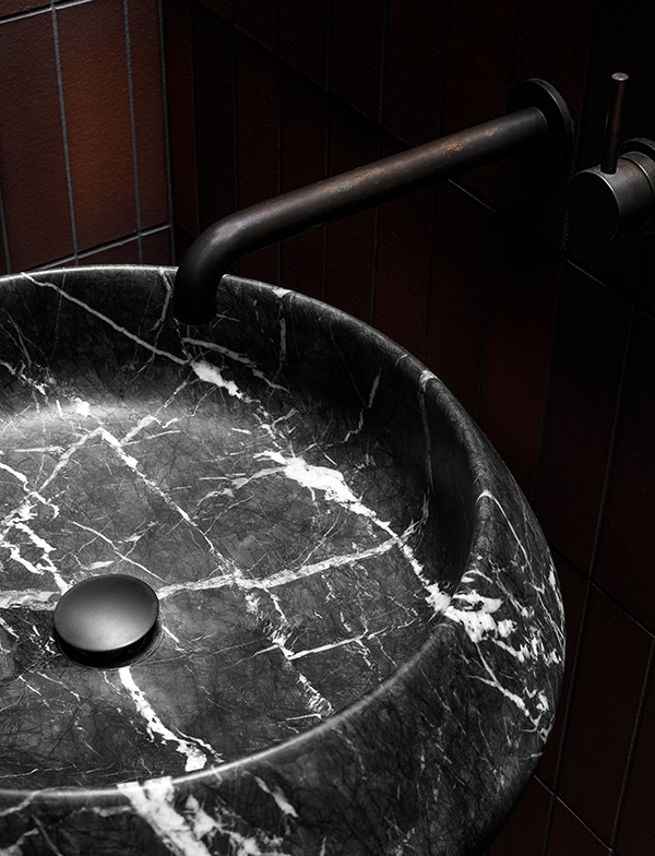 Our Antique Brass Medium tapware was chosen for the powder room as it pays homage to the history of the home with its natural finish and beautiful simplicity. The contrast of deep maroon tiles against stunning cobalt blue results in a dramatic and simply breathtaking aesthetic. The addition of bold marble accentuated by the rich shade of our aged brass creates a space that is sophisticated and uniquely striking.