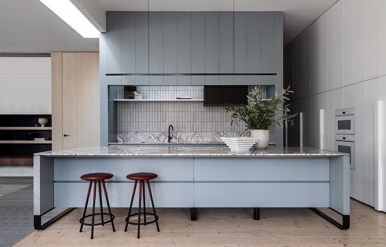 We love the muted blue cabinetry featured in the kitchen, complemented by cool-toned splashback tiles for a calming and understated feel. The white and grey variegated marble with subtle red veins pairs incredibly with the ox-blood bar stools. Further warm tones are brought into the space through the use of wood textures and our Antique Brass Medium sink mixer, creating beautiful contrast and interest. Tall ceilings add to its magnificence and help make use of the abundant natural light.