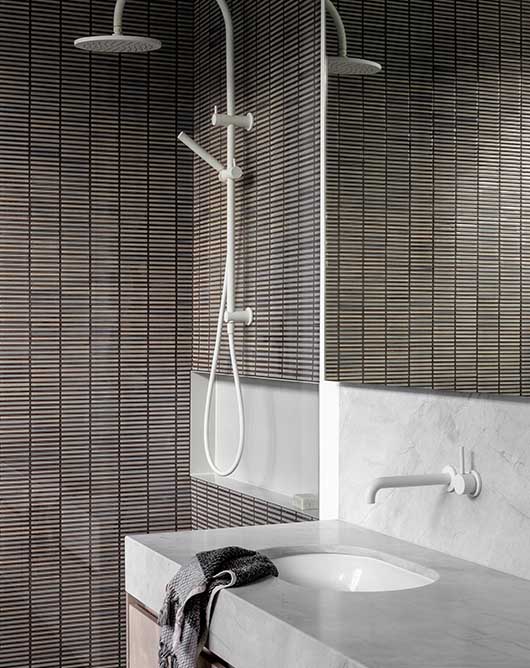 Intricate mosaic tiles cover this time-honoured bathroom, creating a gorgeous golden toned retreat. With a light wood vanity, subtle white stone and our complementing Switzrok Matte White tapware and dual shower, the space is calm and timeless.
