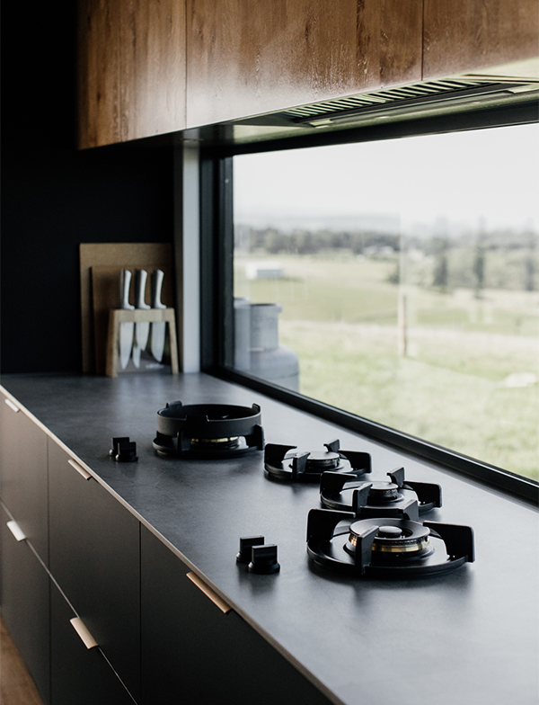 Warm industrial finishes and clever design are what make this kitchen so bespoke. Upper cabinetry in Timberwood Panels adds warmth to the space and the practical and visually appealing integrated gas burners from PITT Cooking make for easy cleaning.