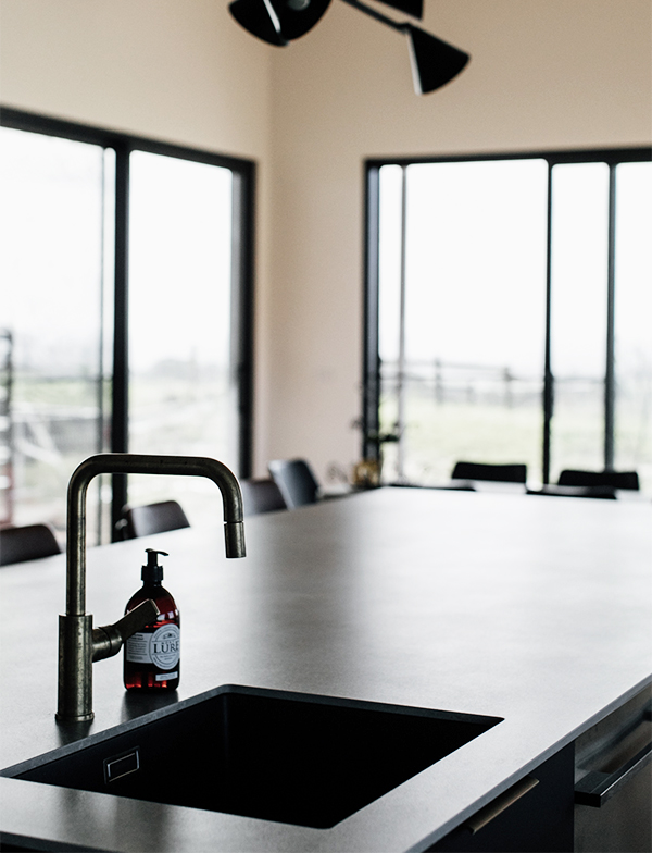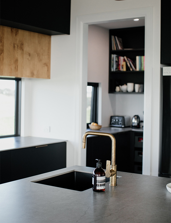 Zeos Sink Mixers with Pull Out nozzles were chosen for the kitchen and butler’s sinks to make for easy cleaning. The Antique Brass Light finish was the perfect choice, as it brings out the warmth in the timber cabinetry and blends well with the dark Cosentino benchtops, for a warm homely feel.