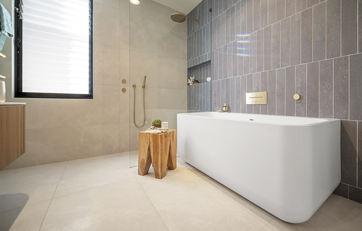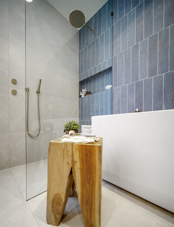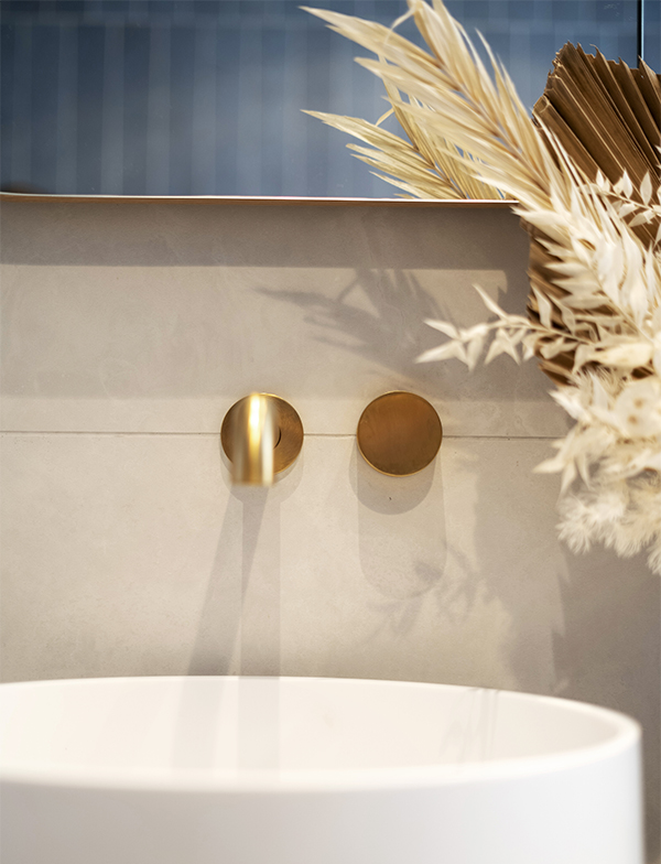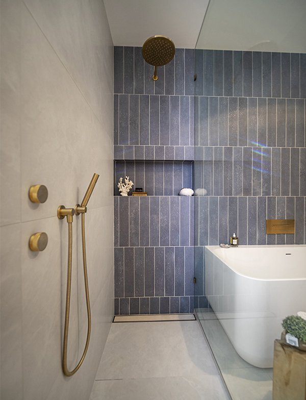 The blue concrete subway tiles, silky stone baths, and knurled Brushed Liberty Gold tapware, all supplied by Amalfi Tiles, work perfectly together to create this beautiful yet practical bathroom.
