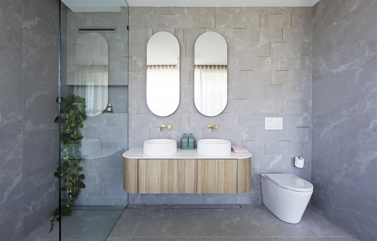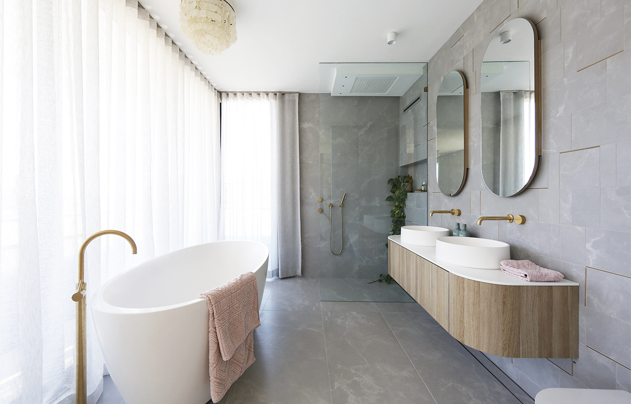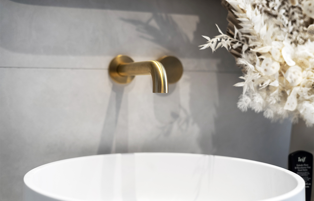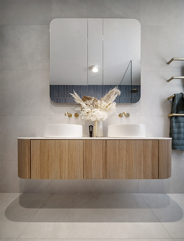 The custom Rifco curved vanity and Brushed Gold N18 Zero tapware were made for each other! We love this pairing from both a sculptural perspective as well as the colouring. Round engineered stone basins, made in Europe, also tie in perfectly with the overall design.