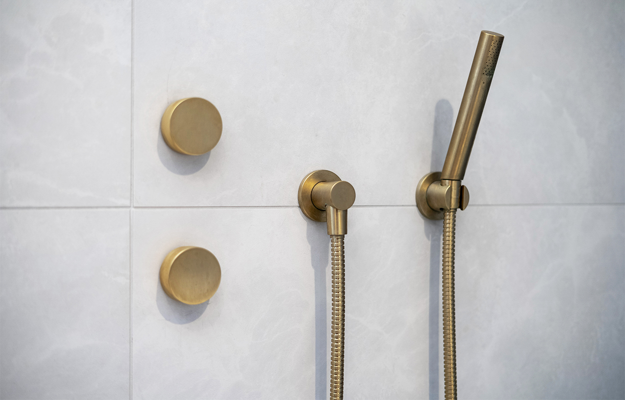 This beautiful little shower cluster, pictured below, showcases the opulence of the Brushed Liberty Gold finish, and the simplicity of the new Zero wall mixers, which have been used to control both an overhead shower, and a hand-held shower, perfect for the family bathroom. This satin finish along with the knurling on the wall mixers brings texture to the space and looks perfect paired with the Stardust tiles by Amalfi Tiles.