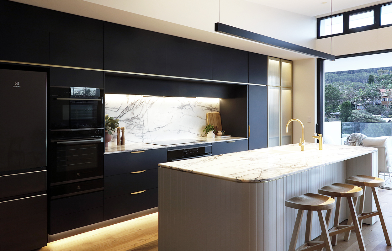 The kitchen design is bold and beautiful. The deep blue wall cabinetry adds sophistication and is further enhanced by the strip lighting underneath and the gold accents. The island features curved corners clad in white panelling and is topped with striking New York marble.