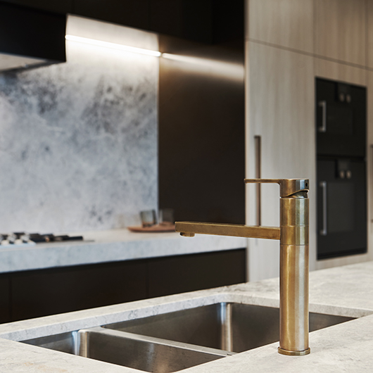 A contemporary extension to a 1800's bluestone cottage featuring Zeos tapware in…